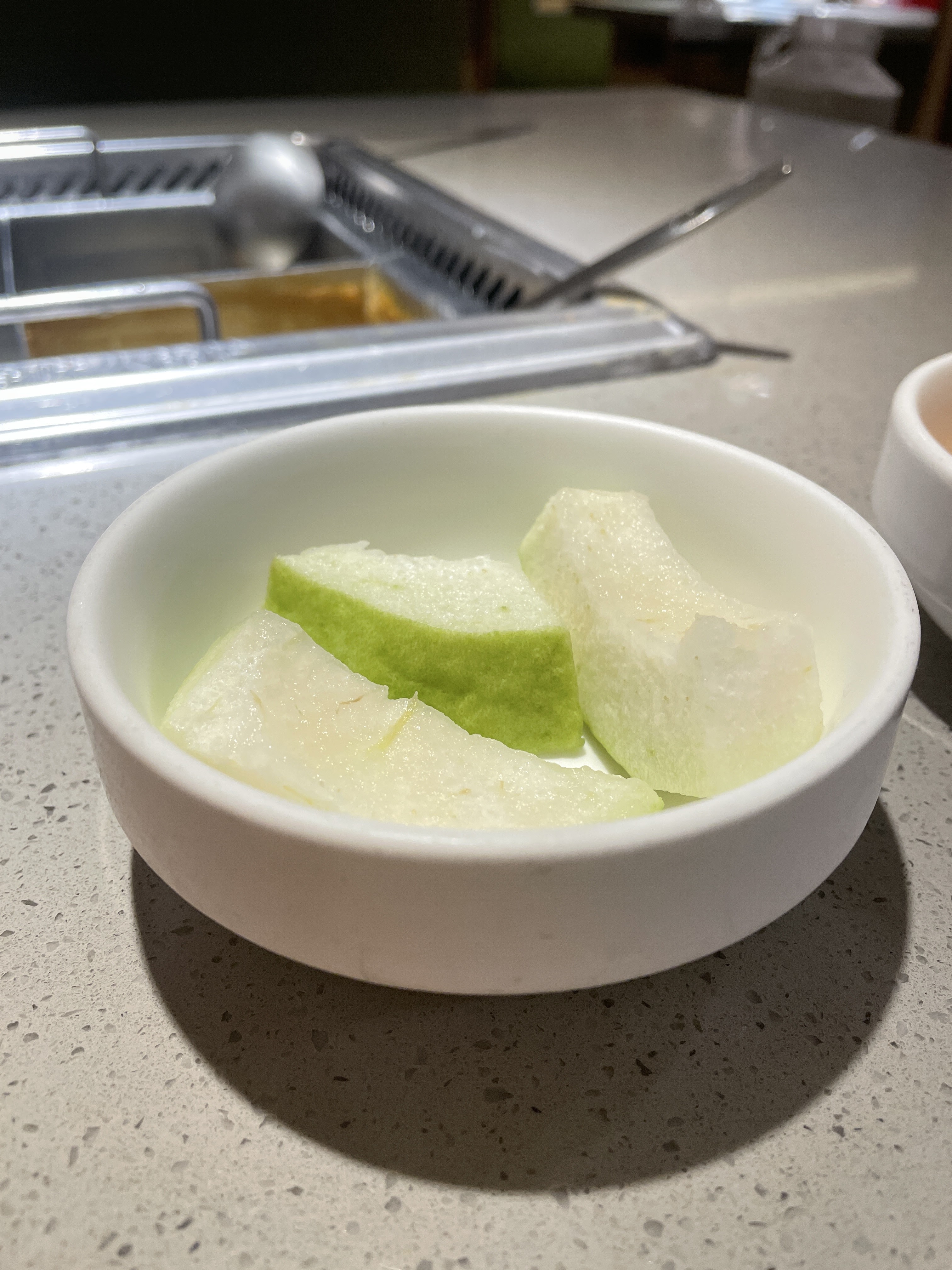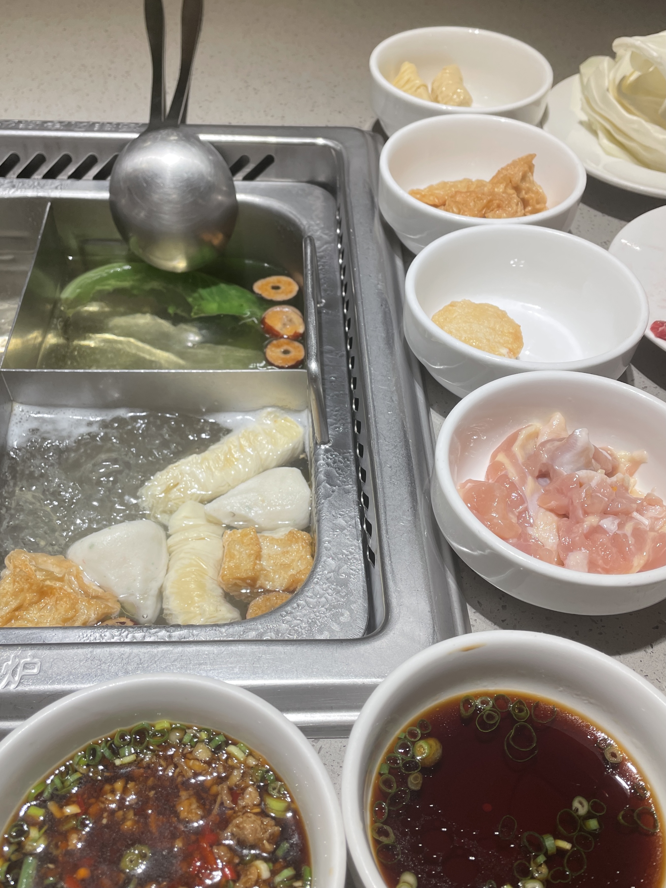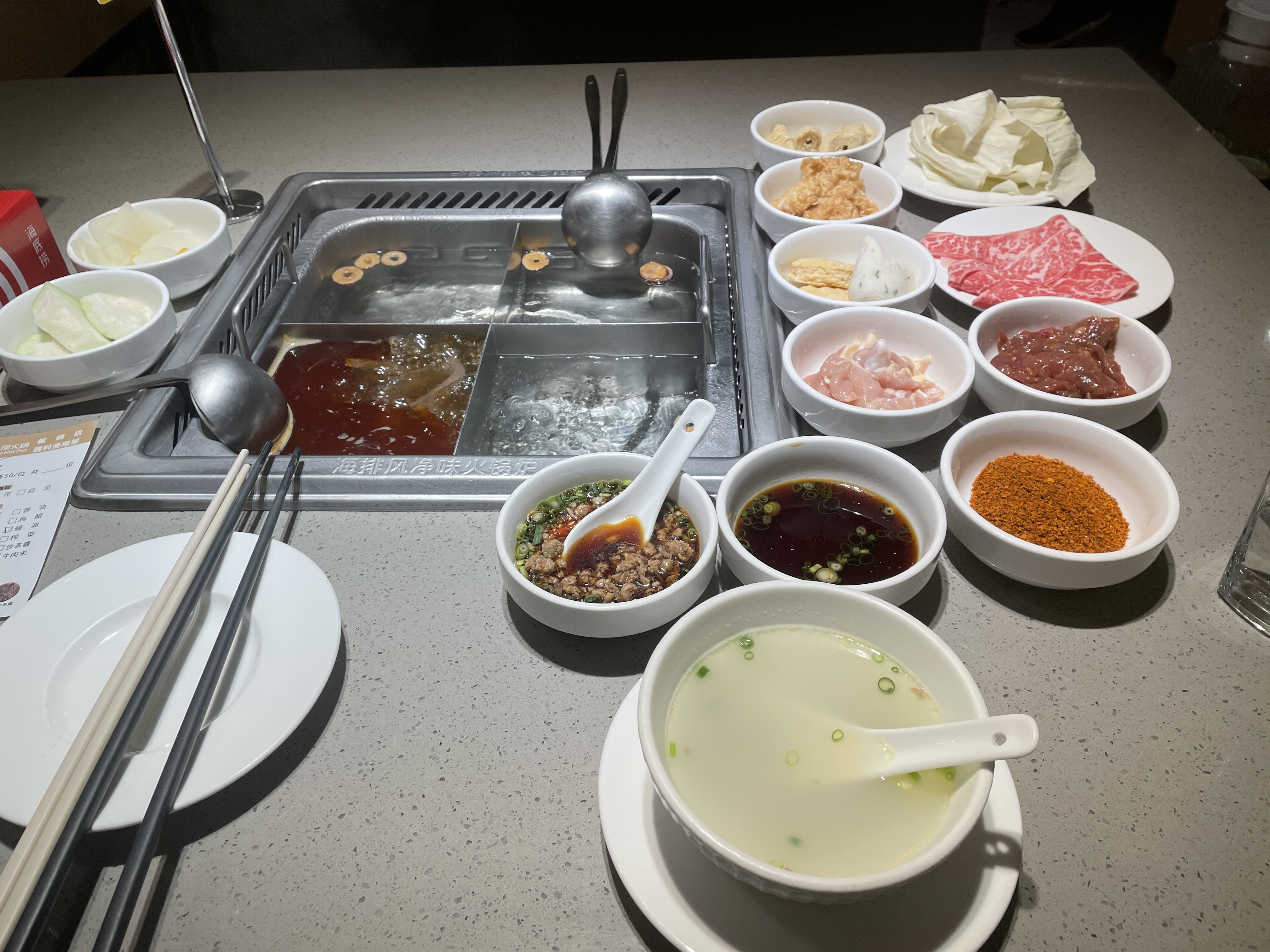 我點麻辣湯底,服務生還送來一碗三鮮湯跟我說先暖暖胃